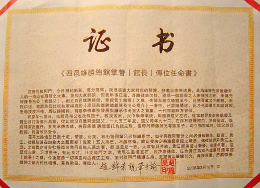 Chew Kam Wing now is in his mid 80's and he and his fellow classmates had a meeting and all agreed that he should pass on his Keeper's position to his kung fu brother Wong Gong . All the senior members of Chan Cheong Mo's students believe Wong Gong has achieved the greatest success in the teaching of Choy Li Fut. On February 16, 2006, Chew Kam Wing officially signed the certificate of Jeong Moon Yen to Wong Gong as the new Keeper of the Hung Sing School in Jiangmen.